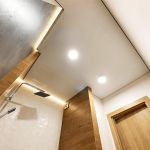 Потолок выглядит оригинально и безупречно. И здесь не нужно использовать специальную подсветку, чтобы создать особый эффект. Но если вы решите выделить зону осветительными приборами, то получите еще более интересную и неординарную иллюзию.